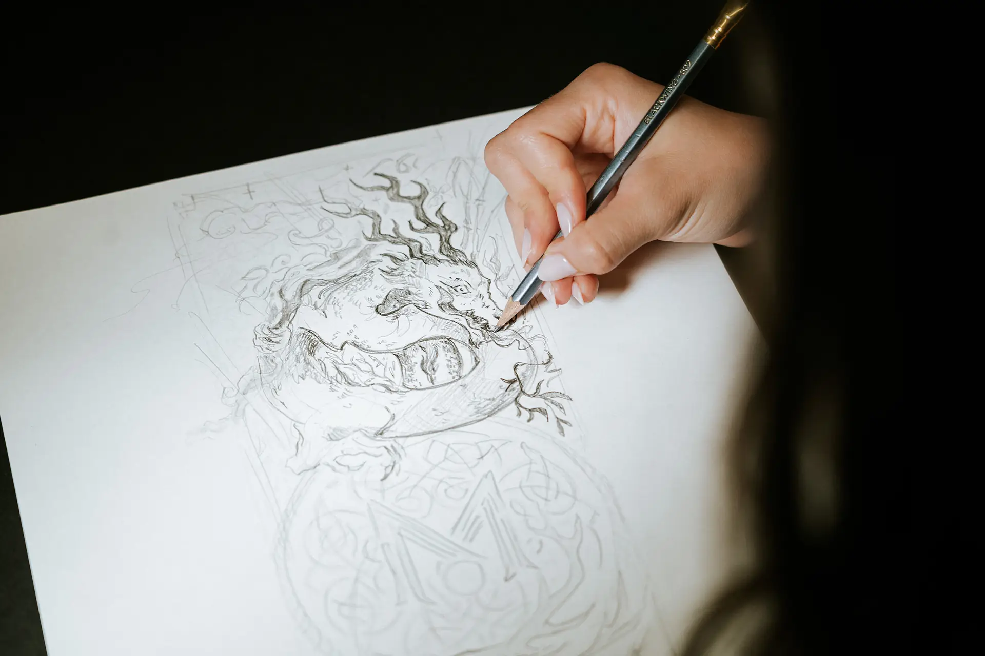 The Maestro outer box began with an intricate hand-drawn artwork by Hannah, whose talent brought the brand’s cultural fusion to life. The design combined Celtic knotwork with flowing Malaysian-inspired motifs, interwoven into a composition that feels timeless and symbolic. Rendered in rich gold against deep black, the illustration creates both drama and depth — a story unfolding across the surface of the box.