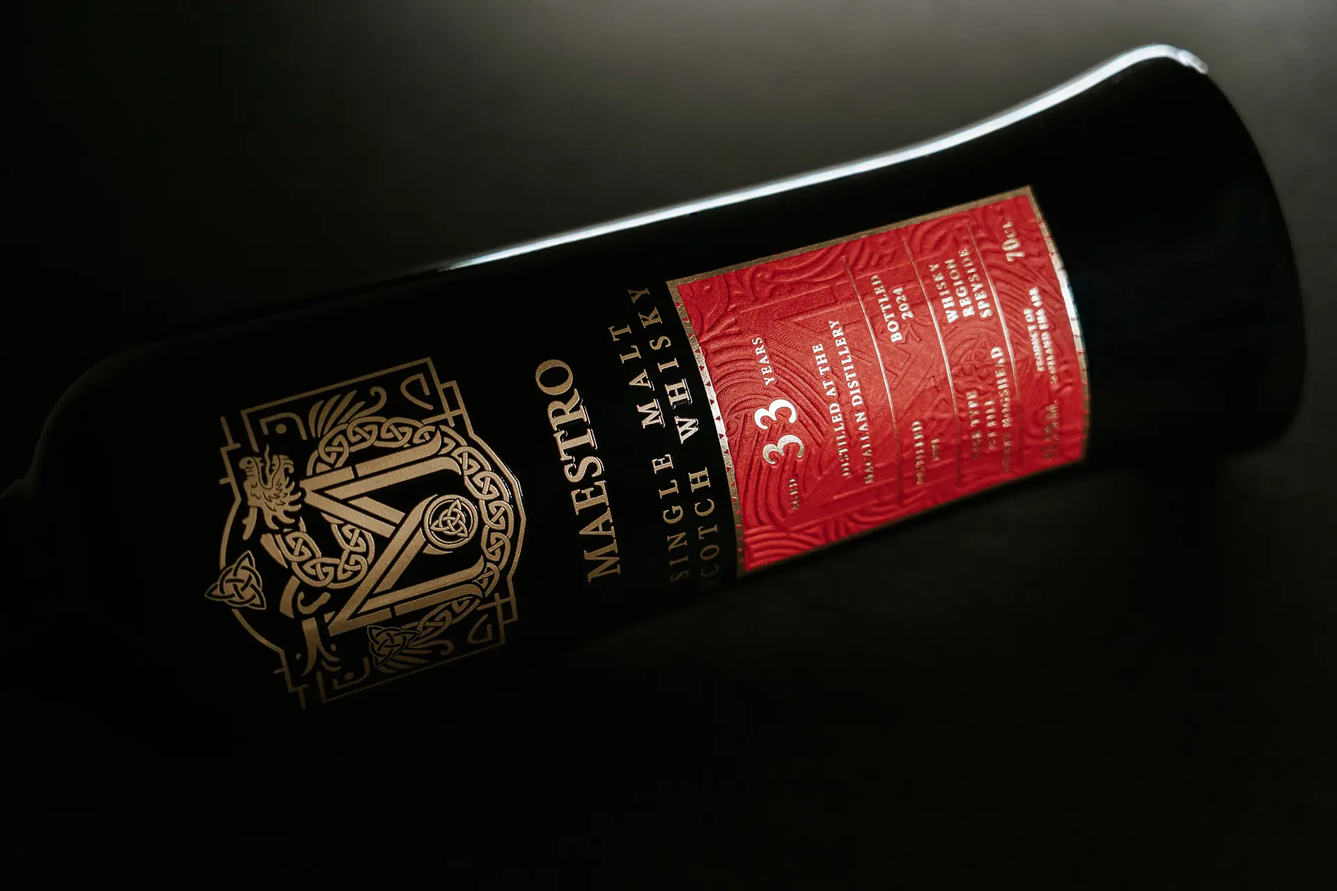 For Maestro, the bottle itself became a statement piece. Its silhouette was custom sprayed in deep black, a dramatic finish that immediately set it apart from conventional glass. This bold choice created a sense of mystery and intrigue, inviting the drinker to discover the rare whisky within.